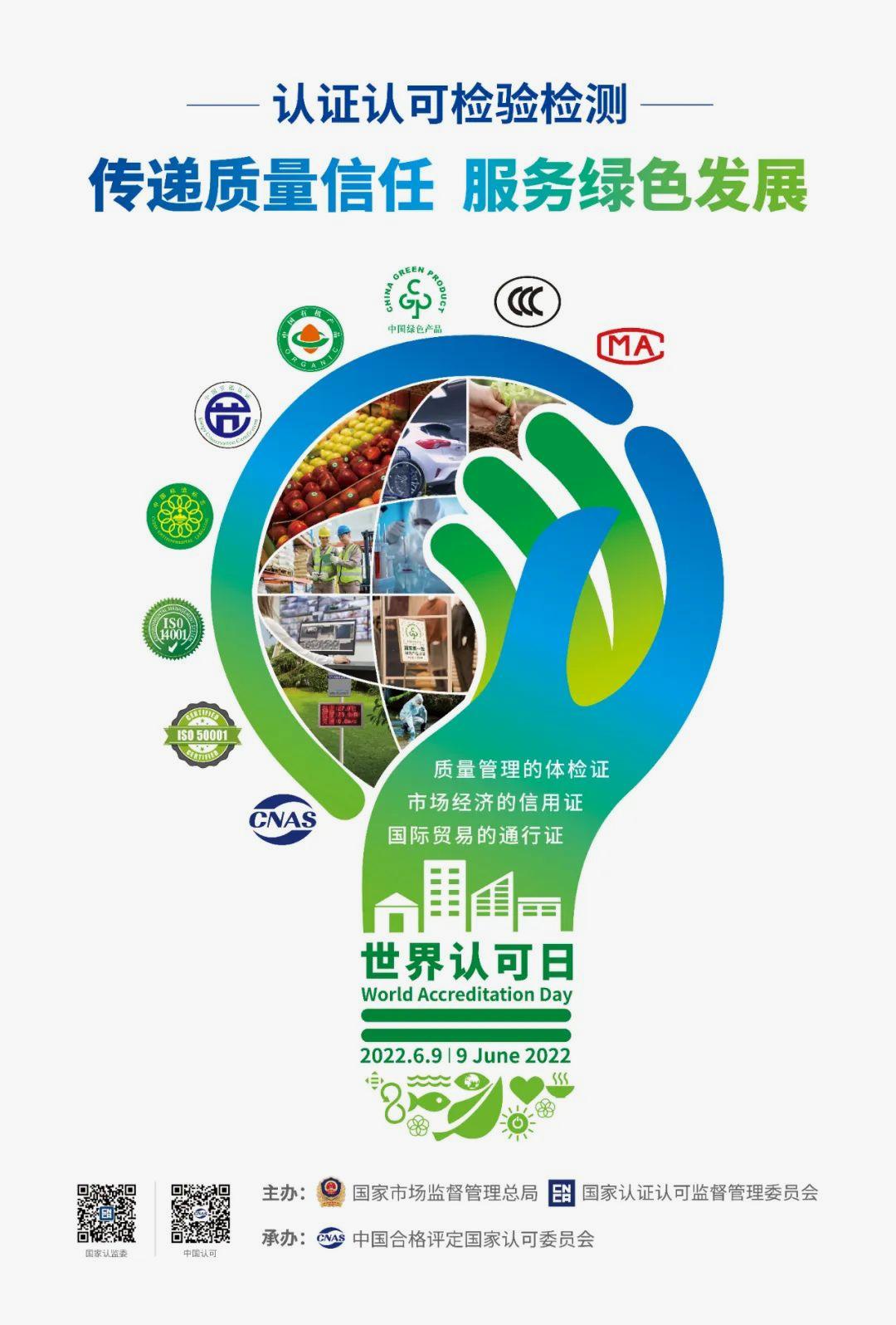 为了大力宣传认证认可检验检测服务绿色发展的积极成效,进一步推动其广泛应用,为实现“碳达峰碳中和”目标、推动经济社会发展全面绿色转型提供有力支撑,我国将“认证认可检验检测:传递质量信任,服务绿色发展”作为2022年世界认可日的国内主题,组织开展一系列宣传活动。