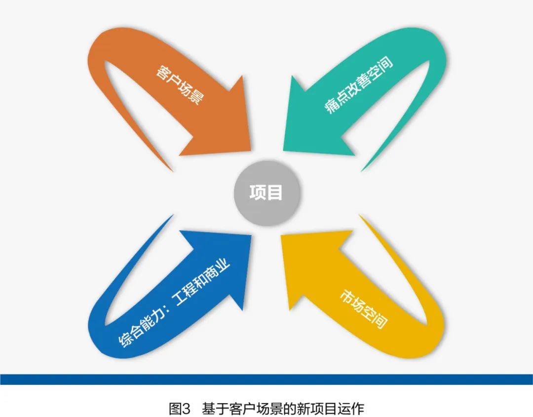 因为这个产品市场上以前没有,很大可能也并不是客户自己主动提出来的需要。场景下的客户需求和新项目运作就是解决这个问题。只有帮客户解决问题,客户购买的概率才会大幅提升。这里还有一个结论:现在企业的产品研发更多要锚定客户场景来展开,而不是市场竞争态势,如图3所示。