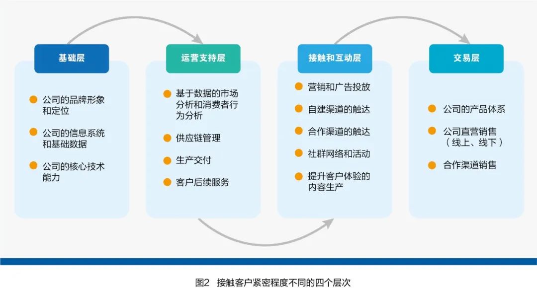 第二,接触和互动层。包括营销投放、自建和合作渠道的触达、社群网络建立及相应的内容生产等,也就是企业选择以什么方式和客户接触。