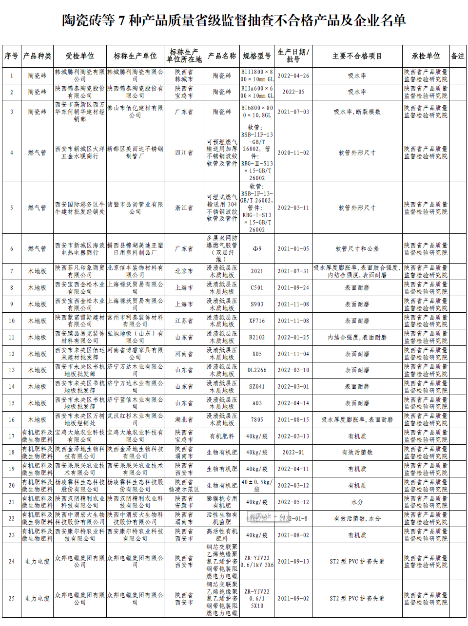 附件:陶瓷砖等7种产品质量省级监督抽查不合格产品及企业名单