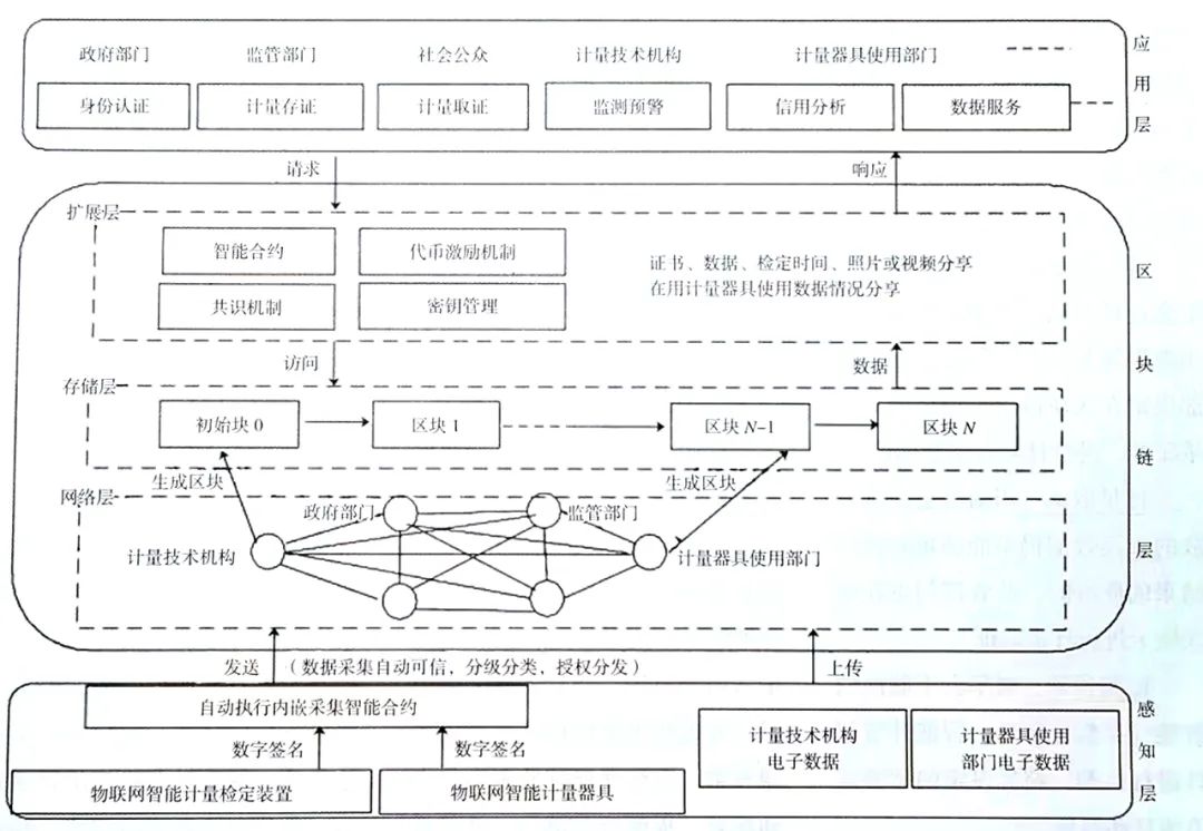 区块链层是平台的核心所在,分为区块链网络层、存储层和扩展层。网络层是P2P网络,政府部门、监管部门、计量技术机构等各主体点对点通信,生成区块,如区块可包括计量技术机构名称、属性等静态数据和由其他节点获取的待分享动态数据,并对生成区块加密后提交上链存储;存储层采用多中心的分布式记账,持久保存各主体的上链区块信息,并存储智能合约代码,可追溯且不可篡改;扩展层是整个区块链层的核心,利用共识机制,执行共享智能合约获取证书、数据、检定时间、照片或视频及在用计量器具使用情况等共享数据,代币激励机制可根据数据共享智能合约,为可信数据提供机构发放代币收益,以此作为奖励。